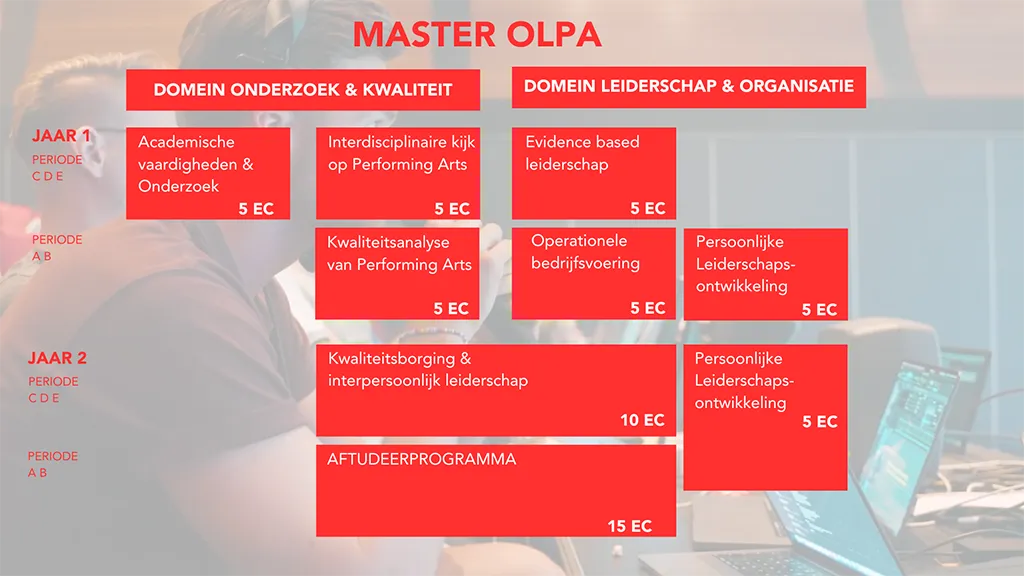 In de master OLPA ontwikkel je je als leidinggevende binnen de performing arts. Of het nou achter de schermen is in het theater, of als leidinggevende in het performing arts onderwijs, jij brengt het team en het resultaat verder. Je leert effectief sturing en begeleiding geven aan de professionals die op het podium of voor de klas staan. Jouw eigen ervaring in het vakgebied leer je gebruiken in het analyseren van de kwaliteit van een voorstelling, performance of lesaanbod. De master biedt jou daarvoor deze modules: